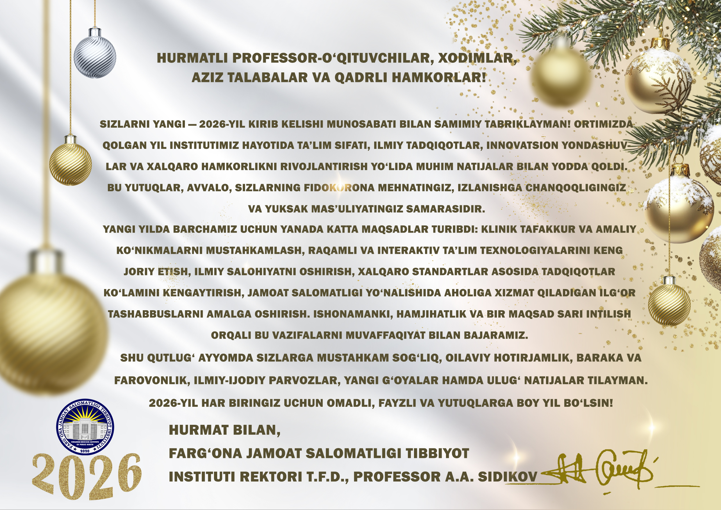 Yangi yilda barchamiz uchun yanada katta maqsadlar turibdi: klinik tafakkur va amaliy ko‘nikmalarni mustahkamlash, raqamli va interaktiv ta’lim texnologiyalarini keng joriy etish, ilmiy salohiyatni oshirish, xalqaro standartlar asosida tadqiqotlar ko‘lamini kengaytirish, jamoat salomatligi yo‘nalishida aholiga xizmat qiladigan ilg‘or tashabbuslarni amalga oshirish. Ishonamanki, hamjihatlik va bir maqsad sari intilish orqali bu vazifalarni muvaffaqiyat bilan bajaramiz.