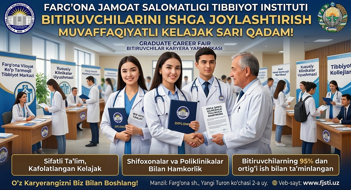 Farg‘ona jamoat salomatligi tibbiyot institutida 2025/2026-o‘quv yili bitiruvchilarini ish bilan ta’minlash va kasbiy faoliyatga yo‘naltirish maqsadida “Kelajakka qadam” dasturi doirasida uchrashuv tashkil...