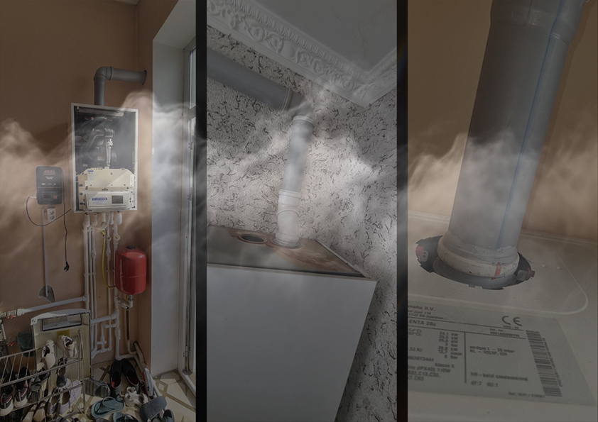 Suratlarda aholi yashash xonadonlarida tabiiy gazda ishlovchi ikki konturli suv isitish qozonlarining xavfsizlik talablariga zid tarzda o‘rnatilgan holatlari aks etgan. Bunday noto‘g‘ri o‘rnatish nafaqat texnik reglamentlarga mos kelmaydi, balki inson hayoti uchun yuqori darajada xavf tug‘diradi.