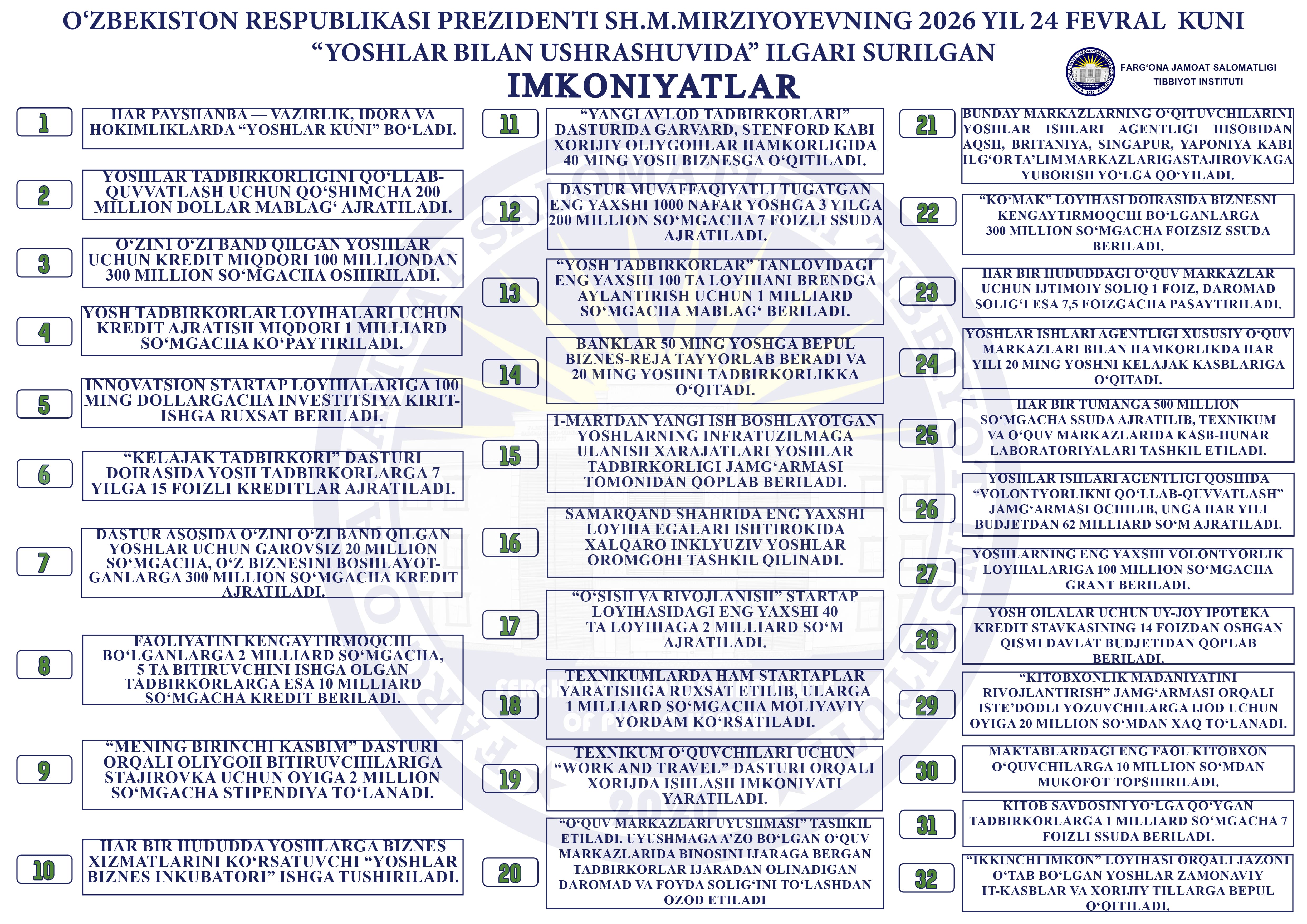 2026 yil 24 fevral kuni Ko‘ksaroy qarorgohida Prezident Shavkat Mirziyoyevning yoshlar bilan uchrashuvida, 60 mingdan ortiq yoshlar vakillari qatnashgan edi. Mamlakatdagi 22 milliondan ziyod yoshlar katta iqtisodiy, ijtimoiy va siyosiy salohiyat ekani, shu bois ular bilan ishlash har bir rahbarning doimiy vazifasiga aylanishi kerakligini ta’kidlagan edi. Vazirlar, hokimlar, ta’lim muassasalari rahbarlari va mas’ullar yoshlarni chet tillari hamda kasb-hunarga o‘qitish, sportga jalb etish, g‘oya va startaplarini qo‘llab-quvvatlash, eng muhimi — ularni ishli va daromadli qilish yo‘lida yanada tizimli harakat qilishi zarurligi qayd etilgan edi. Hech bir yigit-qiz e’tibordan chetda qolmasligi lozimligi uqtirilgan.